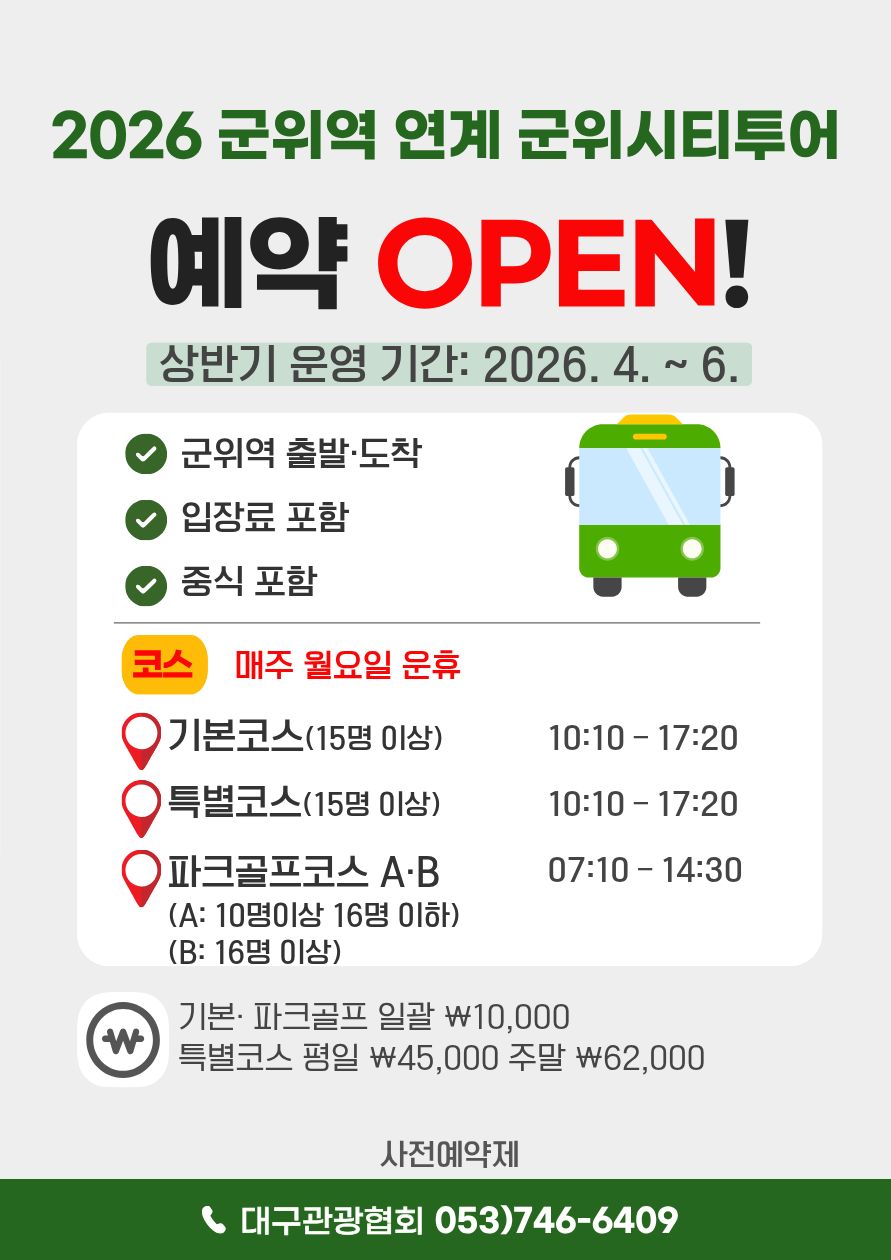 ▶ 문의 및 예약 : 군위시티투어 홈페이지 또는 대구관광협회(053-746-6409)